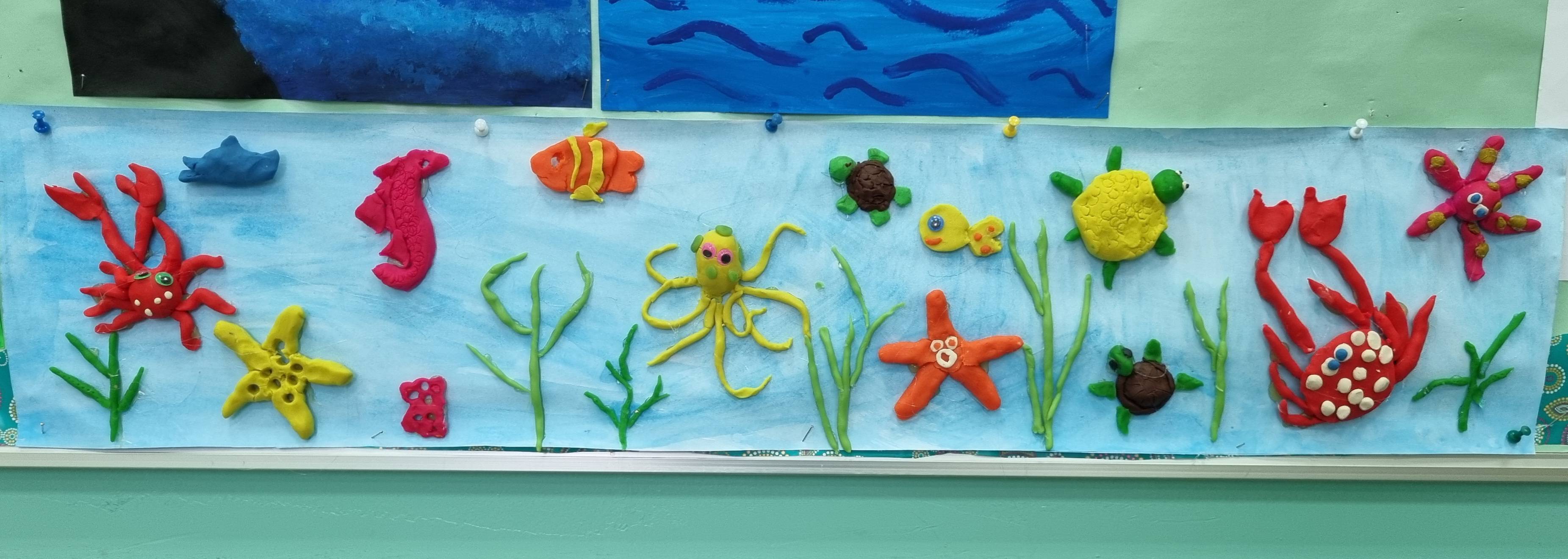 Uz pomoć plastelina smo izradili morsko dno. Svega se tu našlo od biljnog i životinjskog svijeta: hobotnice, rakovi, ribe, morski konjic, kornjače, trave...